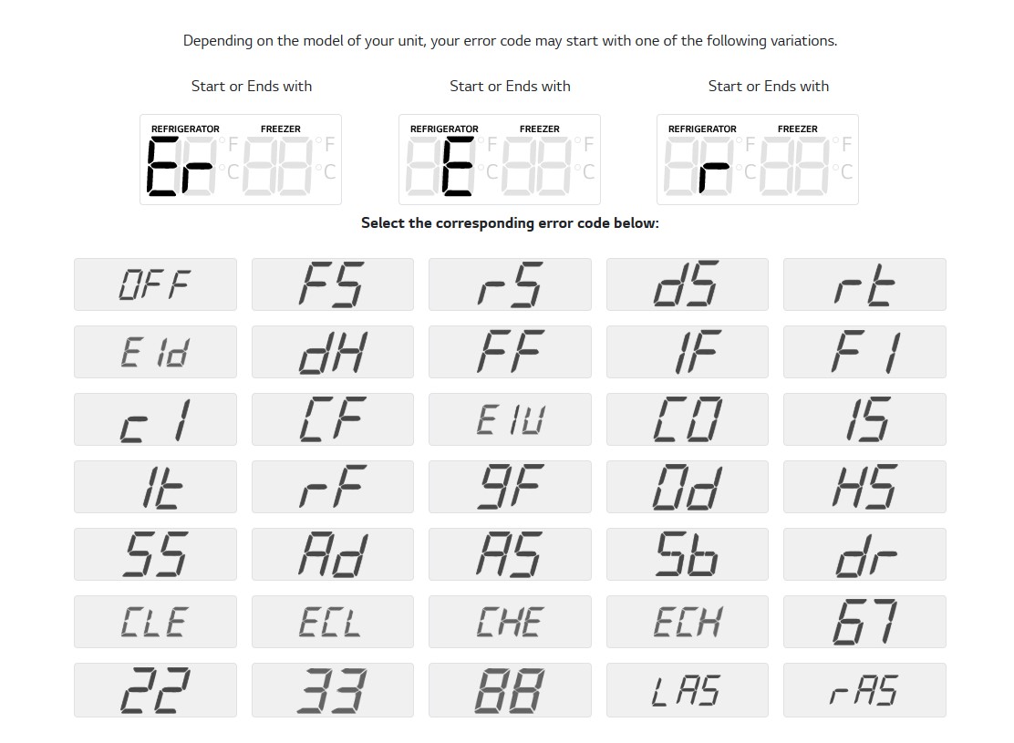 یکی از ویژگی های برتر در طراحی ساید بای ساید ال جی، امکان شناسایی نوع خطا بدون باز کردن بدنه است؛ کاربر فقط کافی است کد نمایش داده شده را از جدول موجود در دفترچه، یا از طریق این مقاله، تفسیر کند.