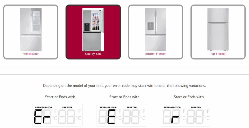 ال جی برای همه مدل های ساید بای ساید خود، یک سیستم کنترل هوشمند موسوم به Smart Diagnosis طراحی کرده که خطاهای عملکردی را به صورت کدهای دو حرفی یا عددی نمایش می دهد. هنگامی که برد اصلی یخچال مشکلی در قطعه ای مانند فن، سنسور، یا المنت تشخیص دهد، یک ارور مانند Er IF یا Er dH روی نمایشگر ظاهر می شود.